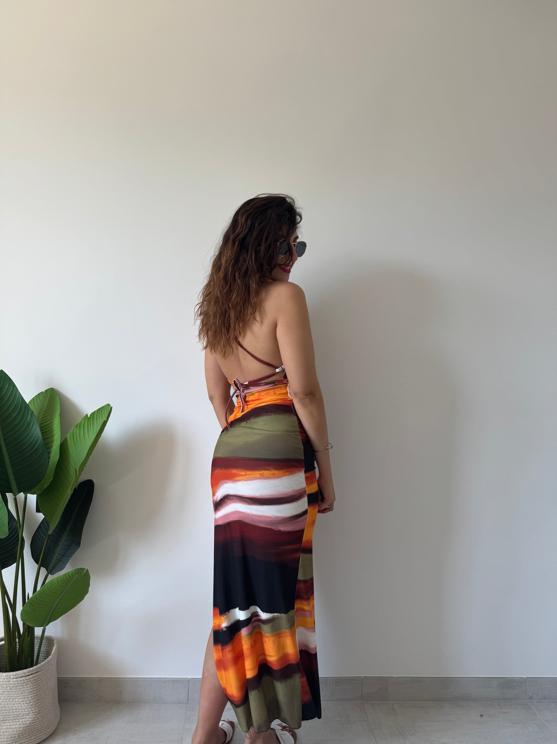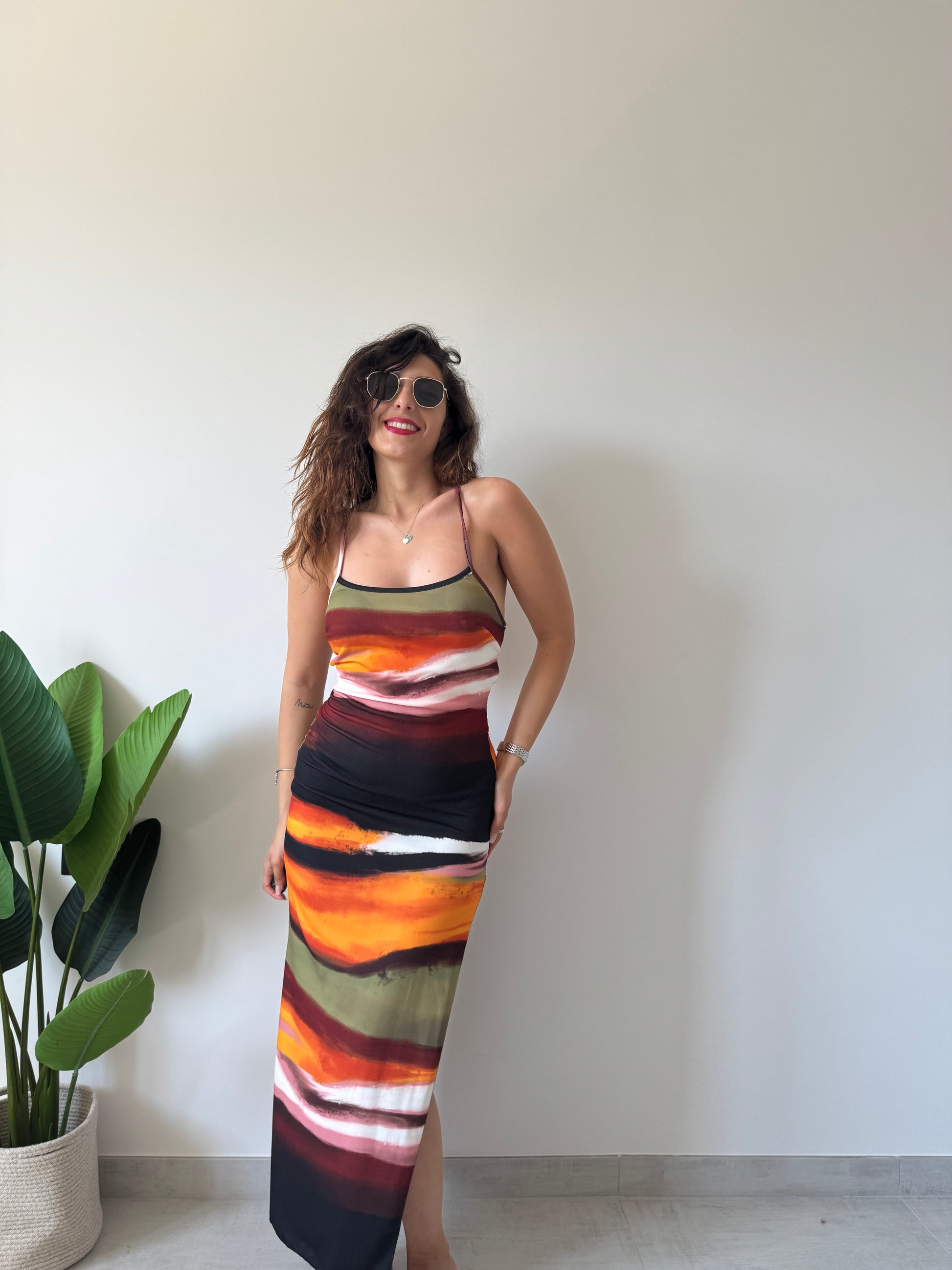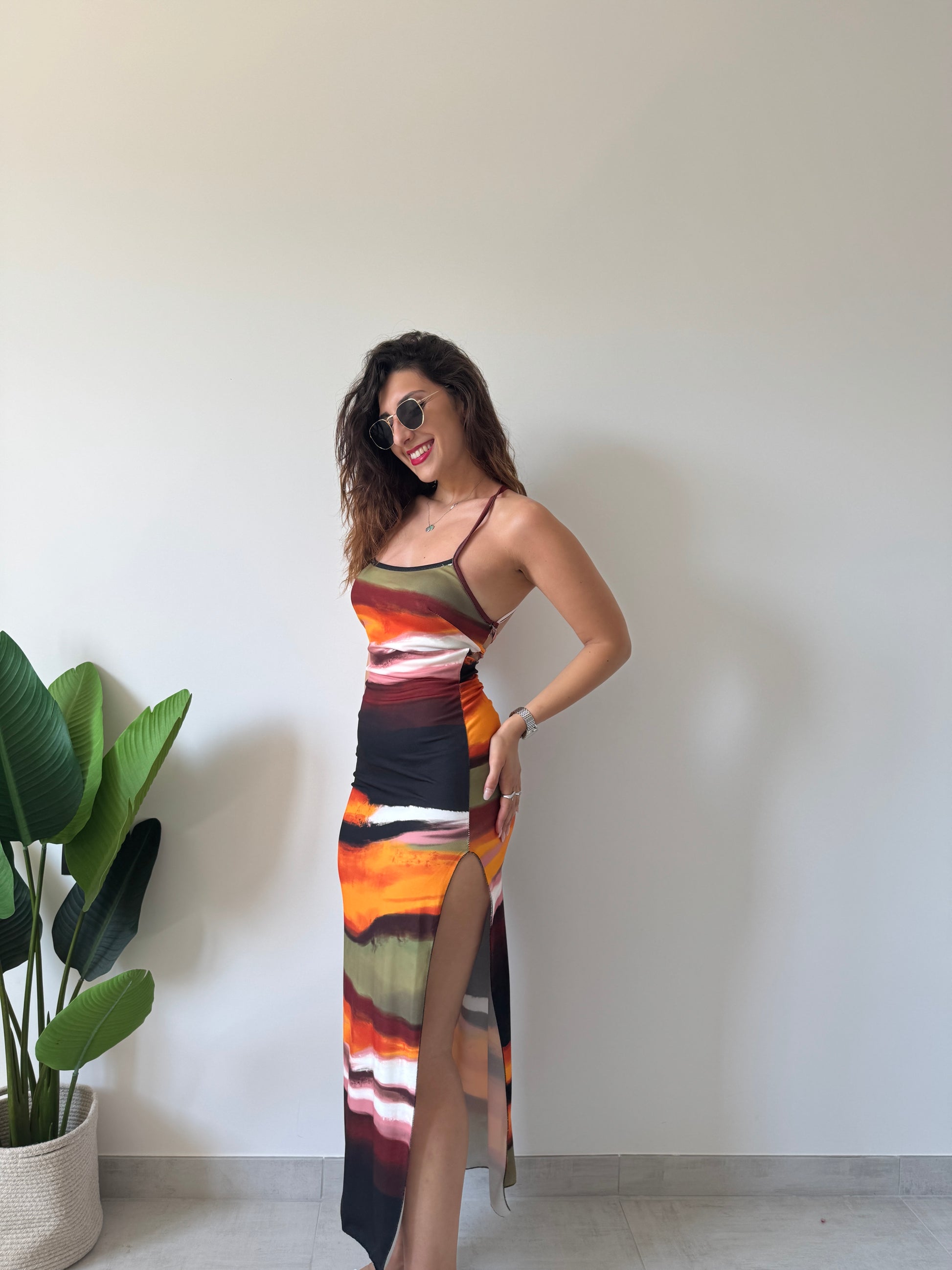 Abito elasticizzato con spacco profondo laterale, coppe interne ed incrocio dietro la schiena. Unica variante colore.