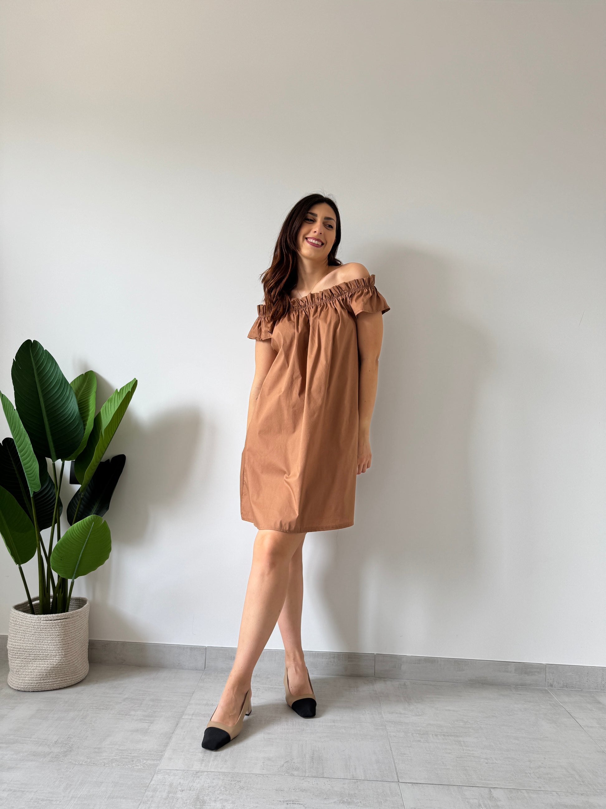 Abito in cotone con elastico sulla parte dello scollo, variante colore cammello.