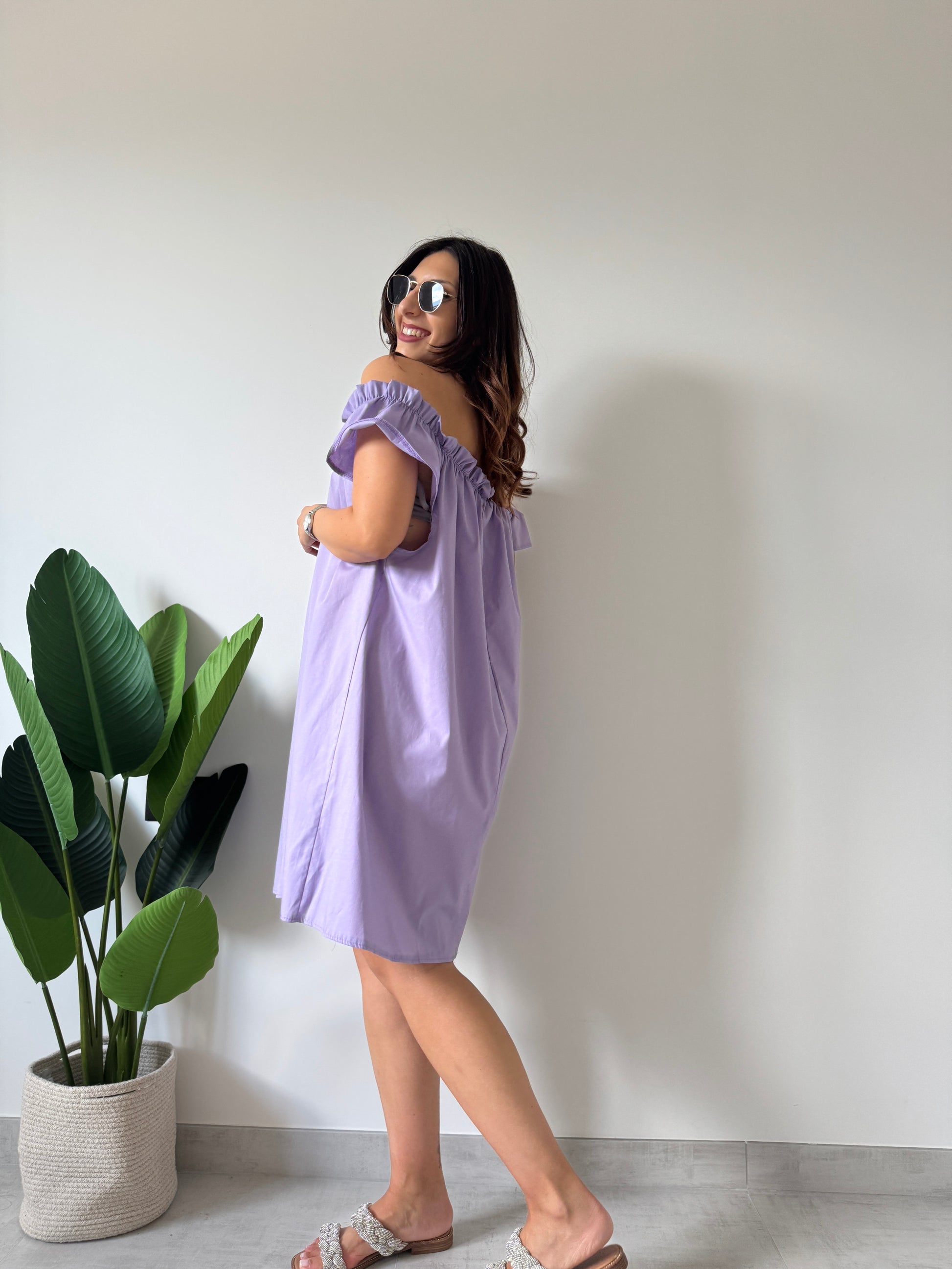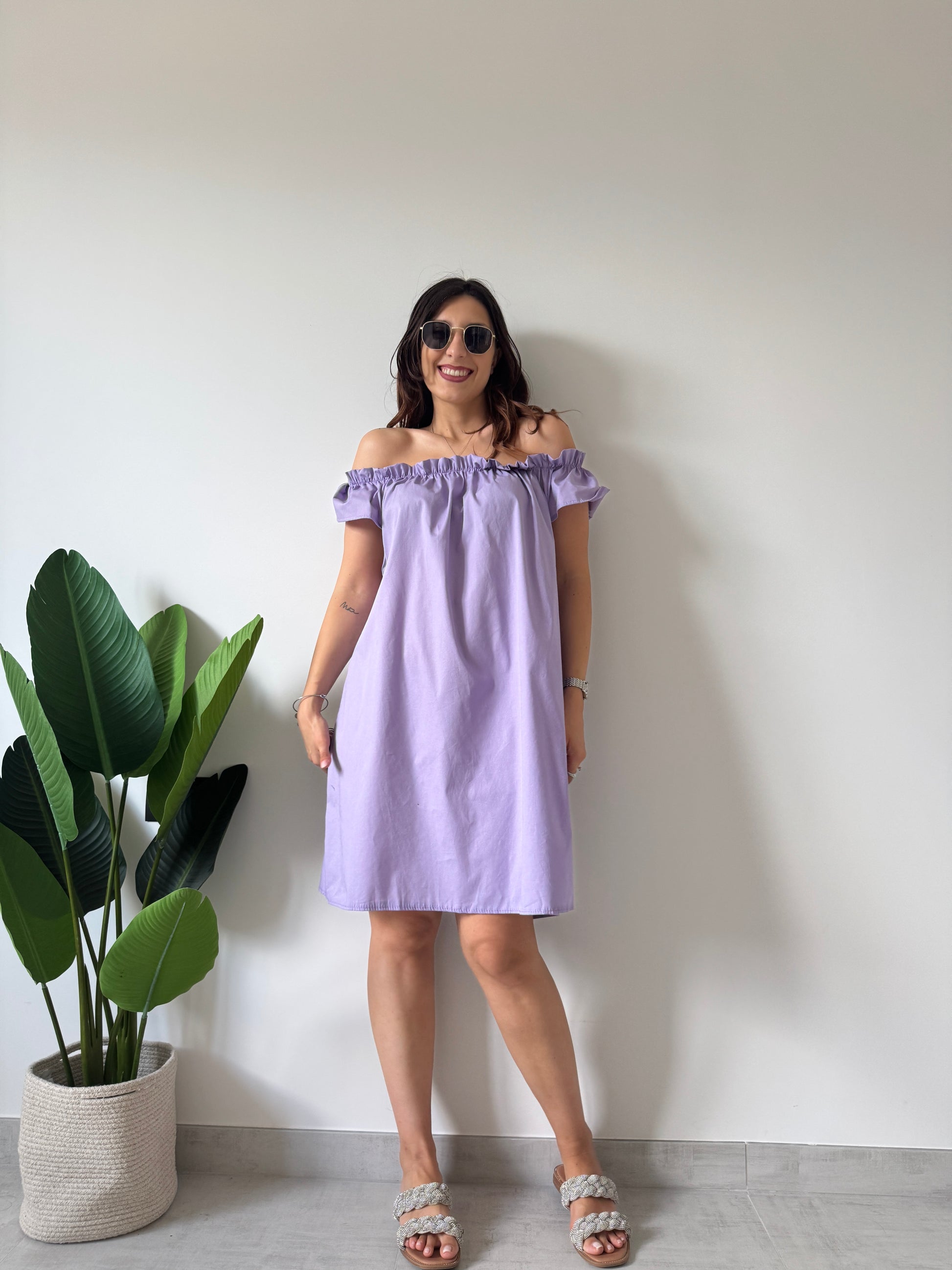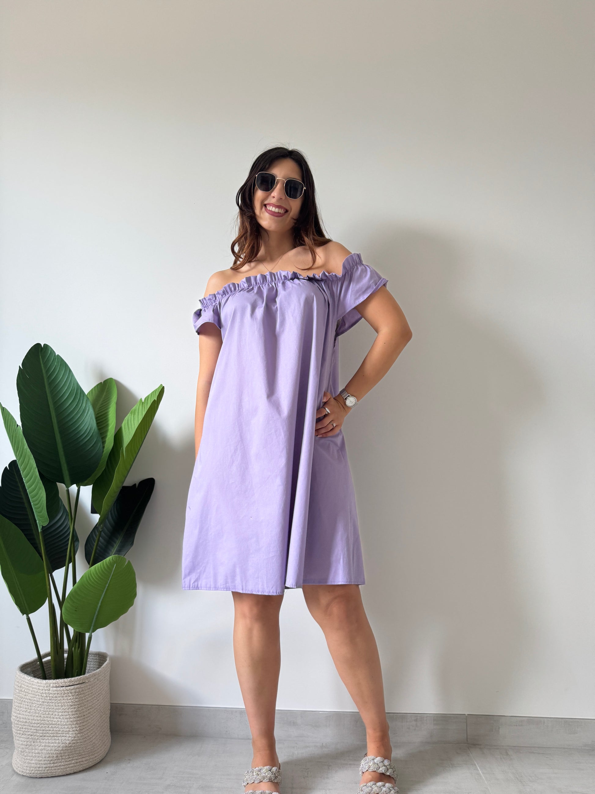 Abito in cotone con elastico sulla parte dello scollo, variante colore lilla.
