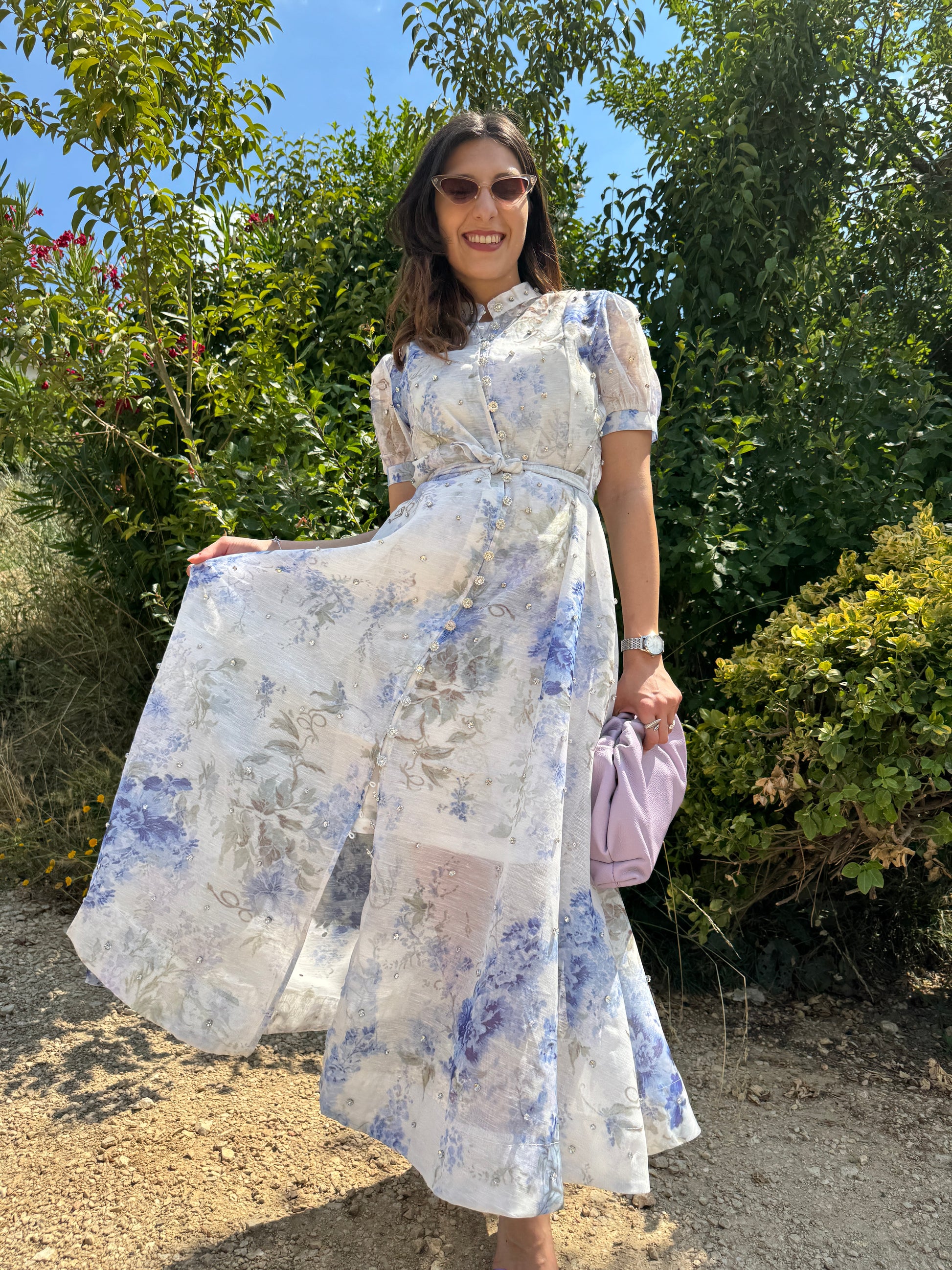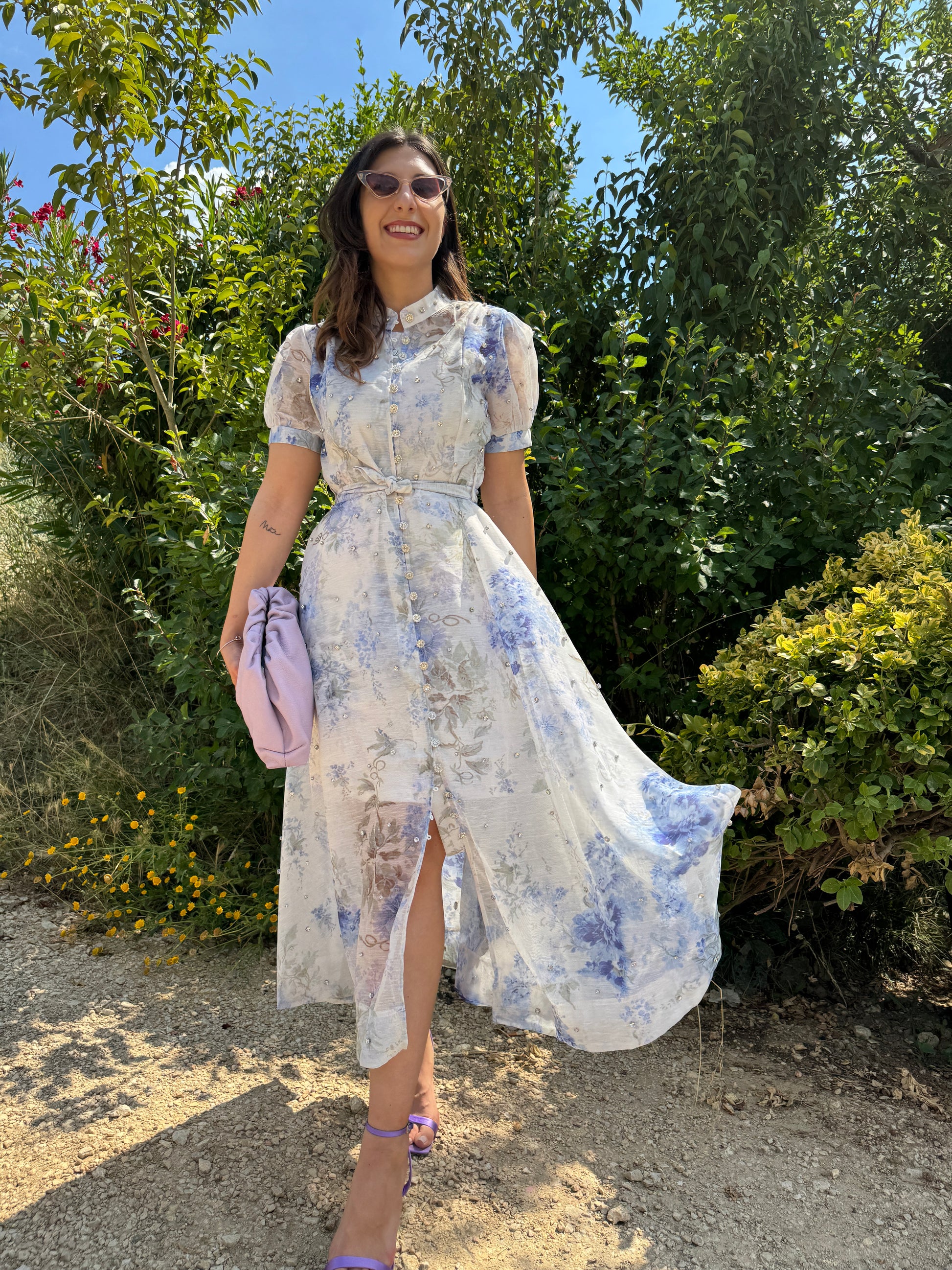 Abito fiorato con base bianca e con sottogonna, swarovski in 3D applicati, manica a palloncino e fusciacca sul punto vita.