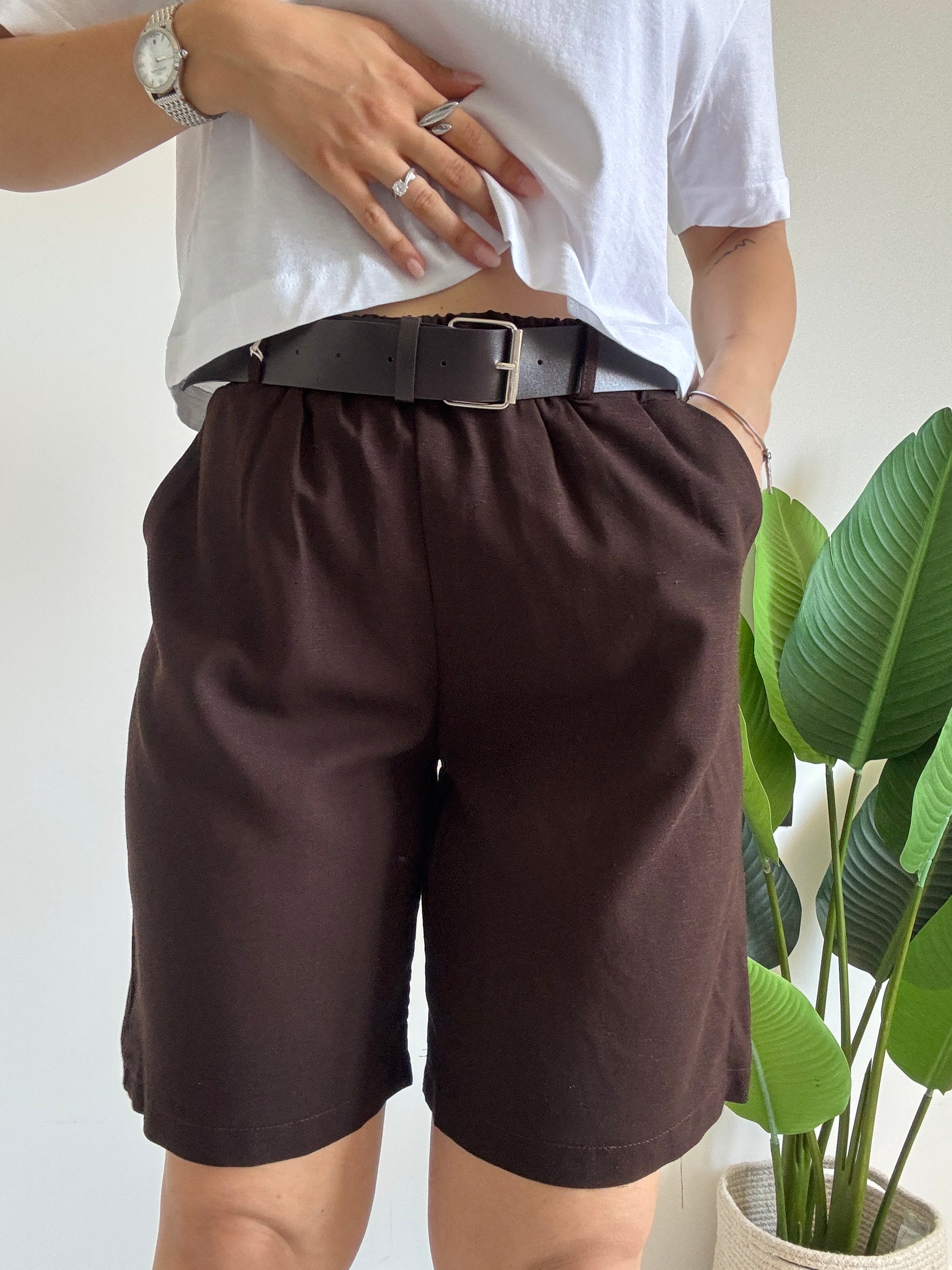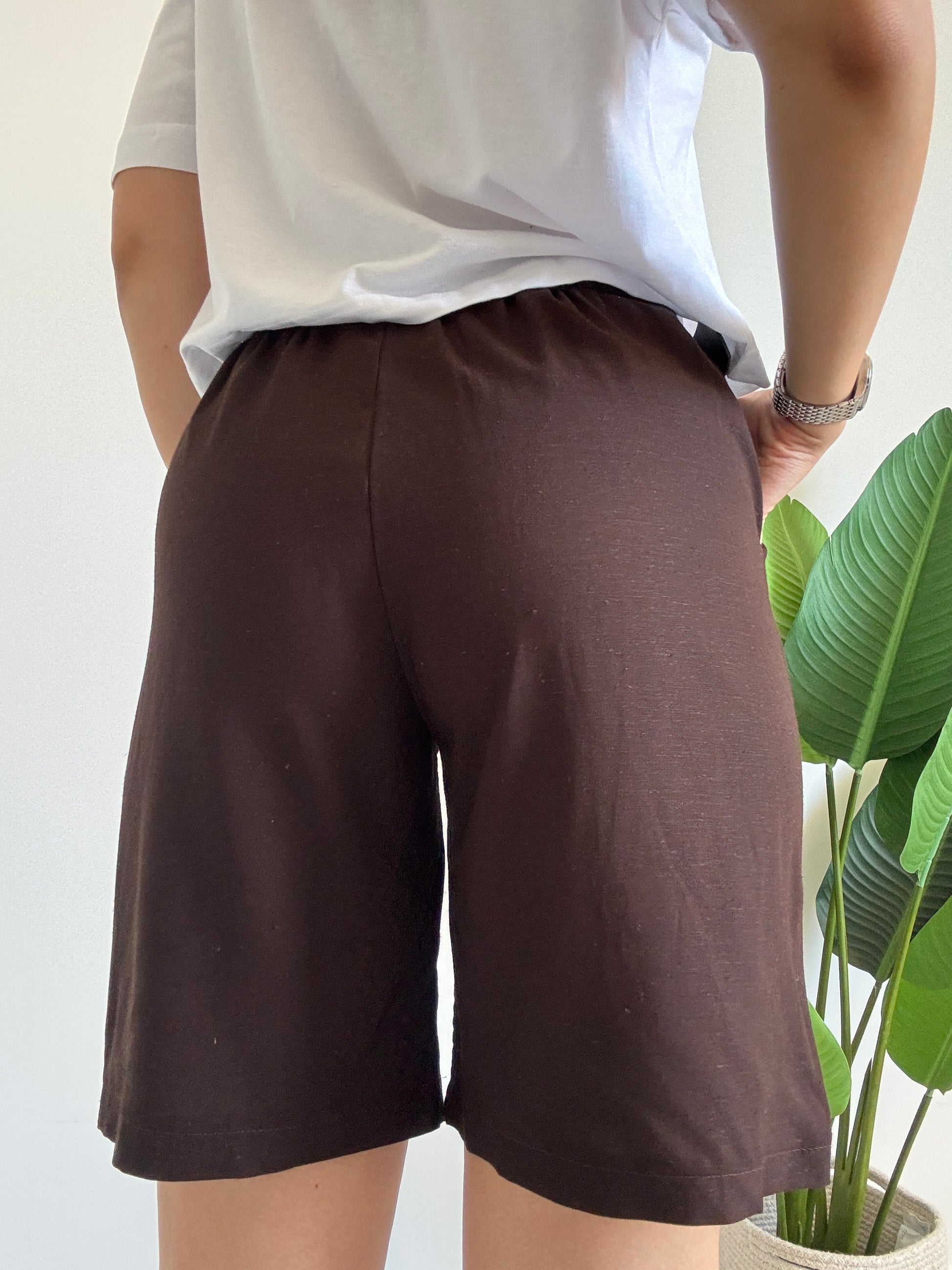 Bermuda con gamba ampia, elastico sul punto vita, tasche laterali e cinturino incorporato. Variante colore cioccolato.