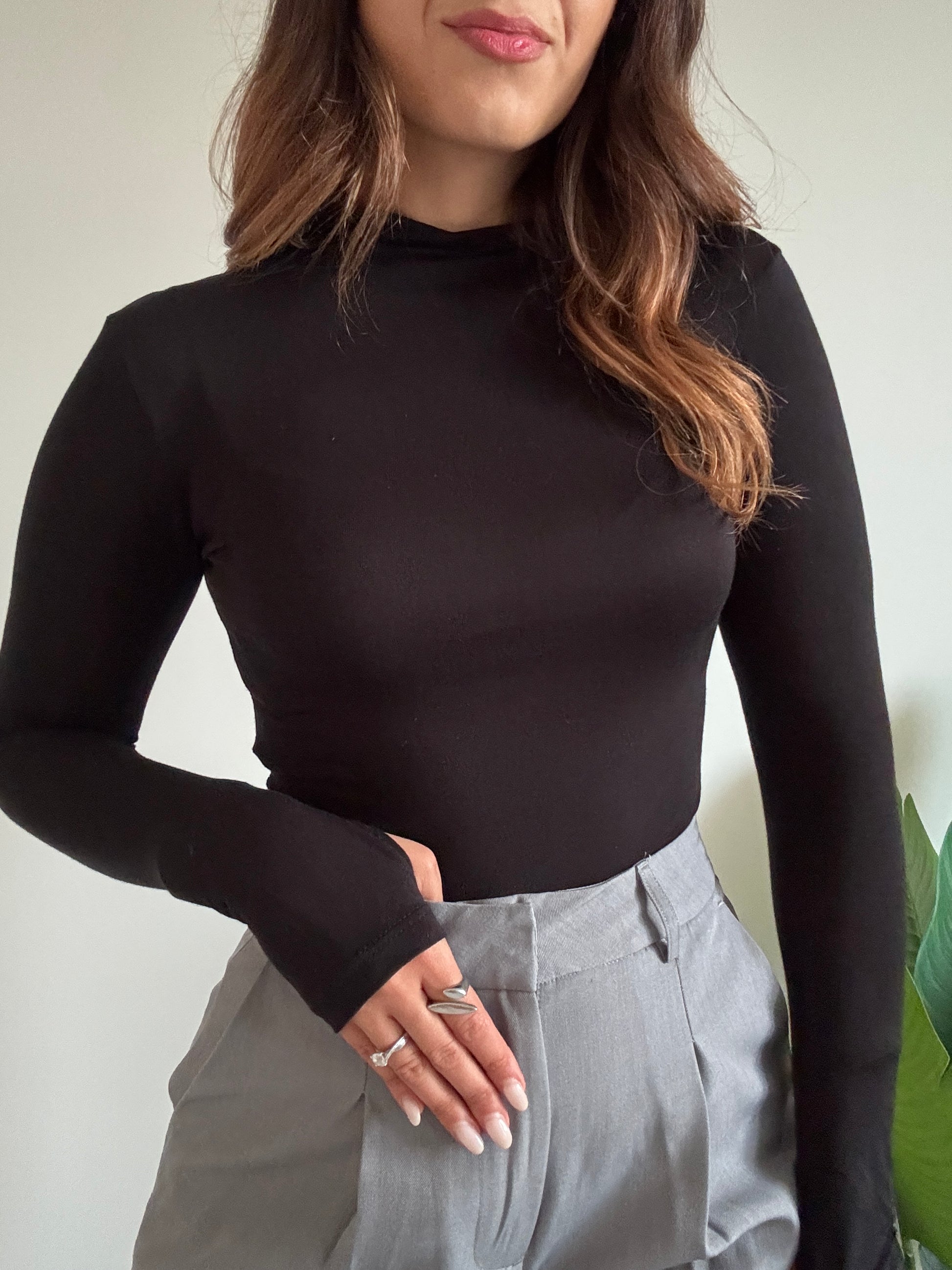 Body in caldo cotone con mezzo collo elasticizzato e manica a guanto, variante colore nero.