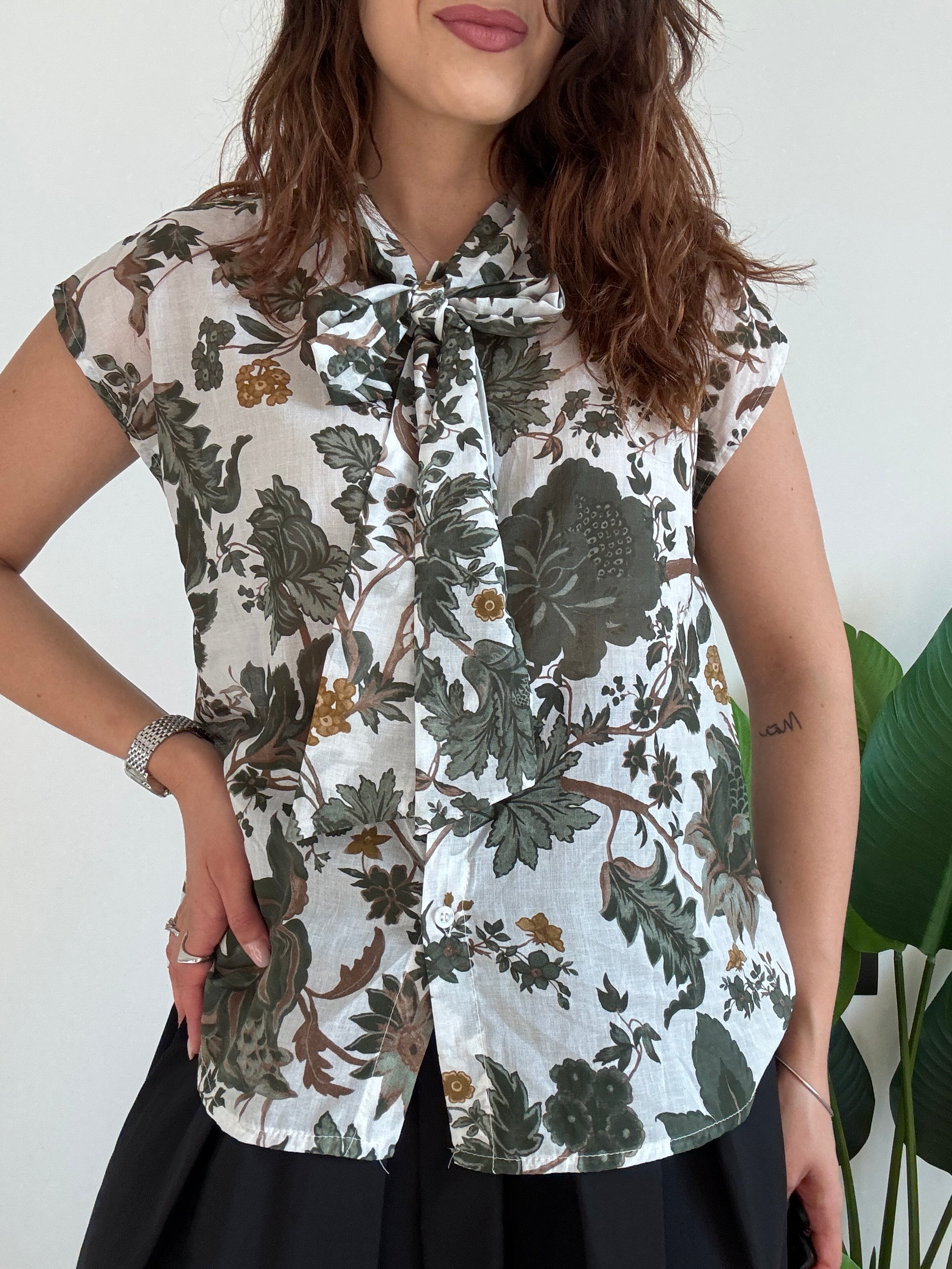 Camicia in mussola di cotone con fantasia, fiocco centrale e manica a giro. Variante colore verde.