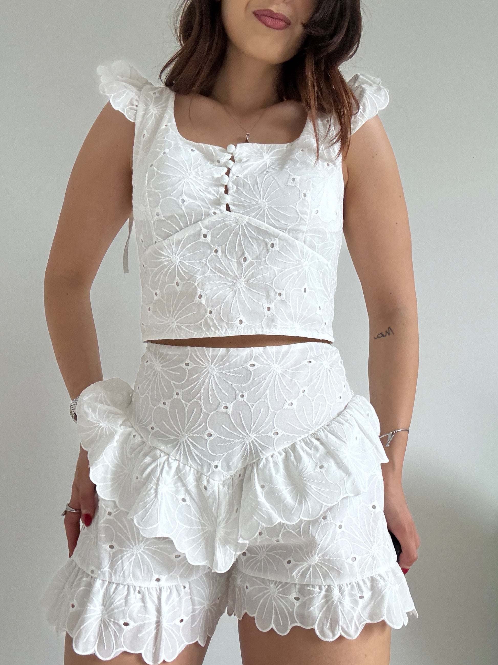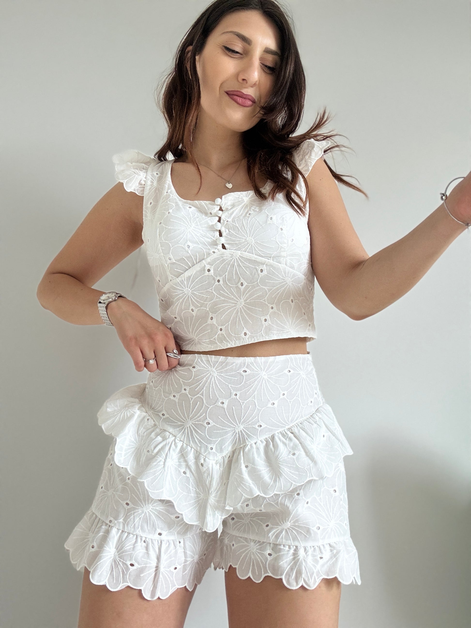 Coordinato in pizzo Sangallo con gonna a pantaloncino ed elastico sul retro. Top con fascia elastica, bottoni centrali e laccio sul retro. Unica variante di colore
