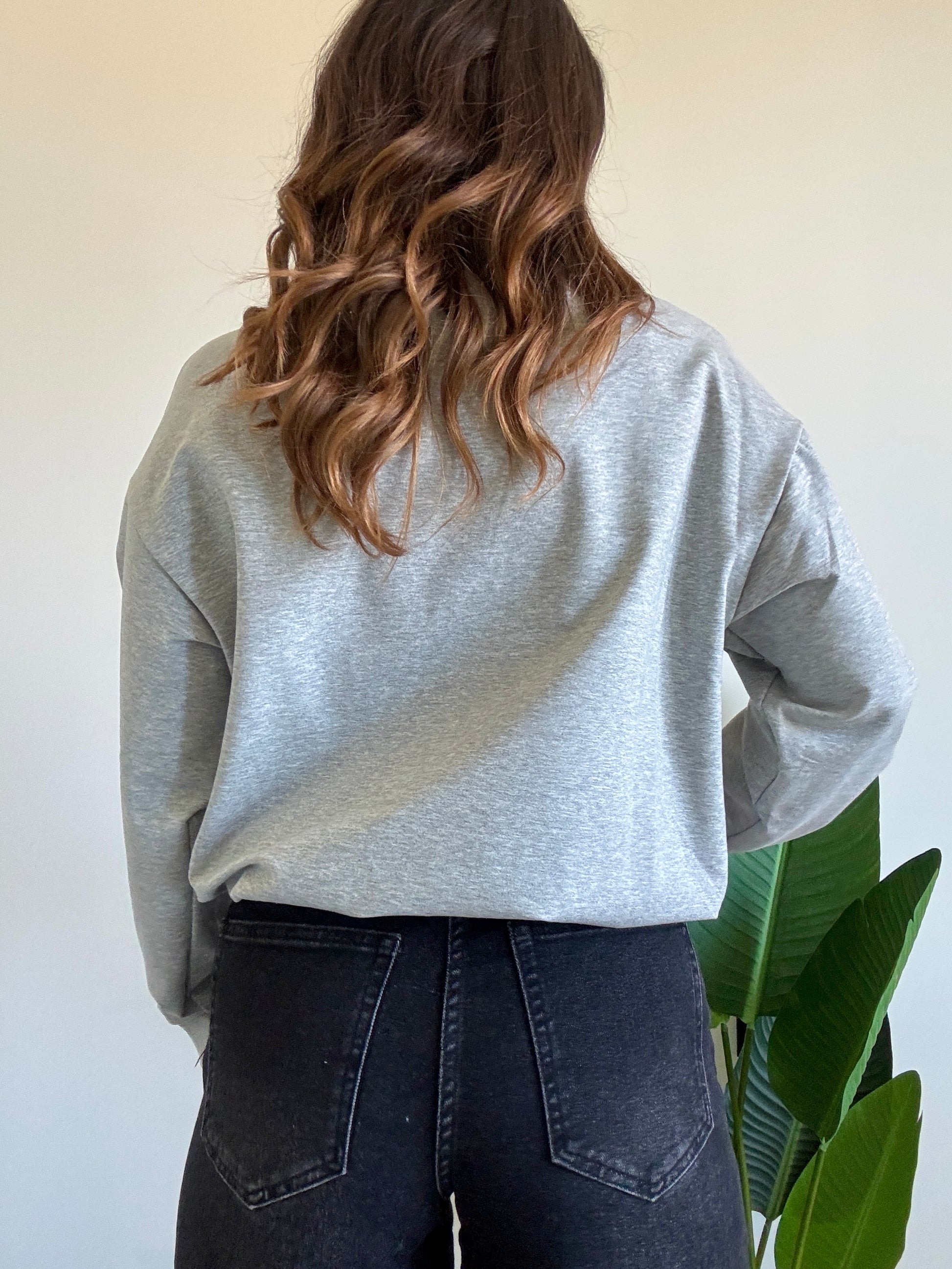 Felpa garzata con scritta centrale e cuoricino con brillantini, variante colore grigio.