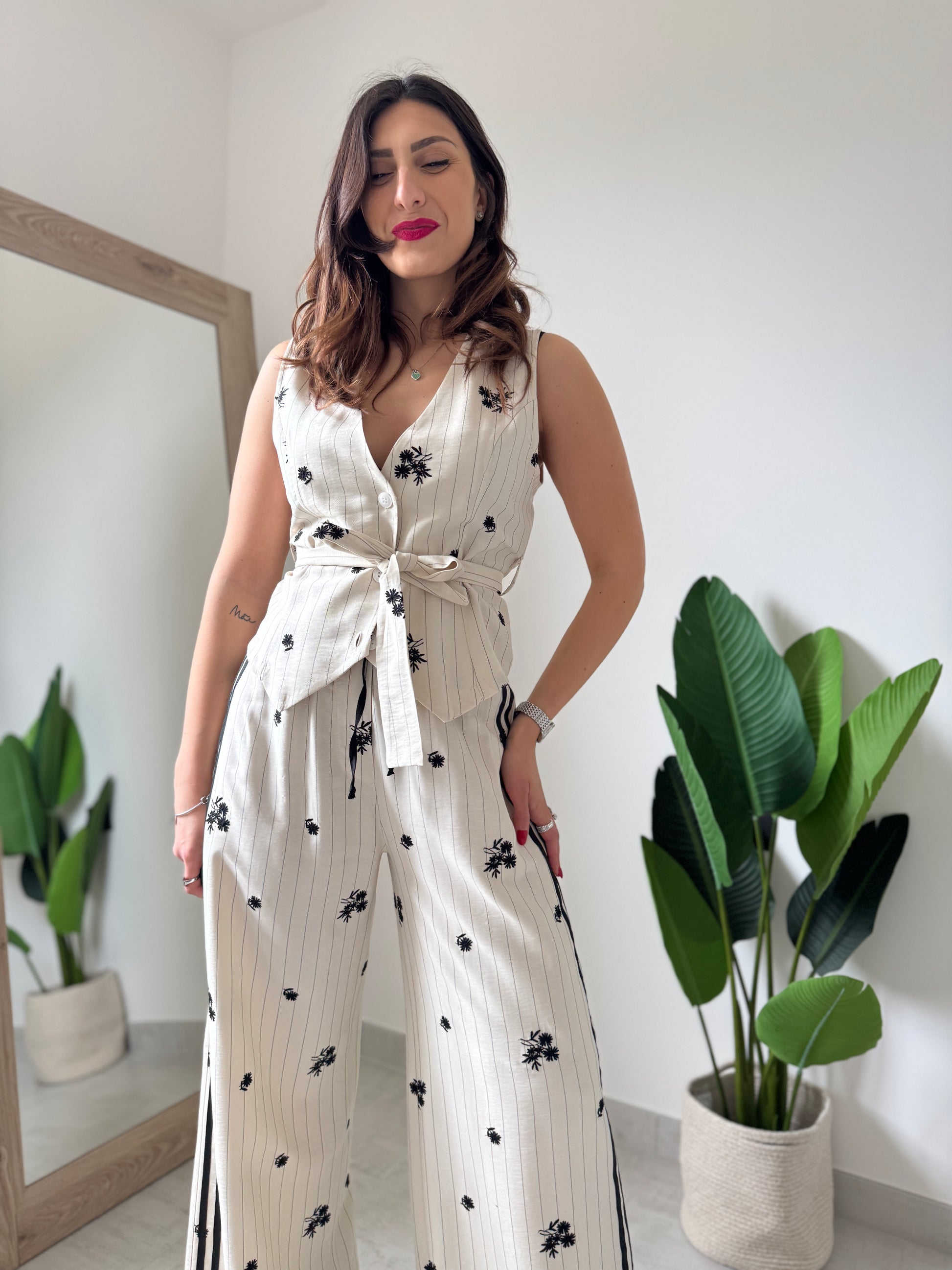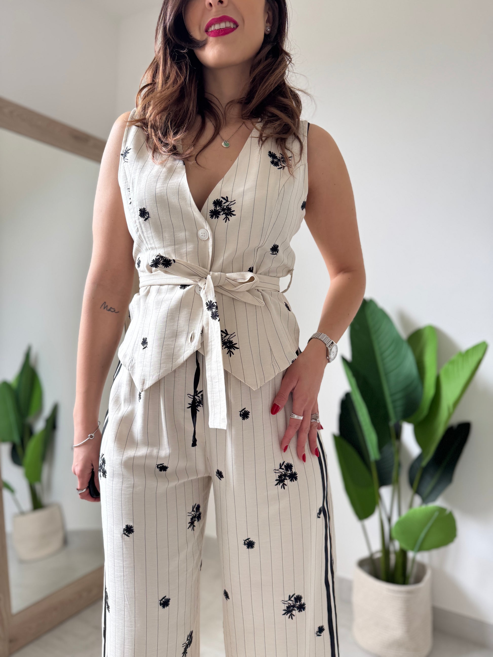 Gilet gessato firmato casa Brend con bottoni di chiusura sul davanti, scollo a V e fusciacca sul punto vita. Vestibilità SLIM.