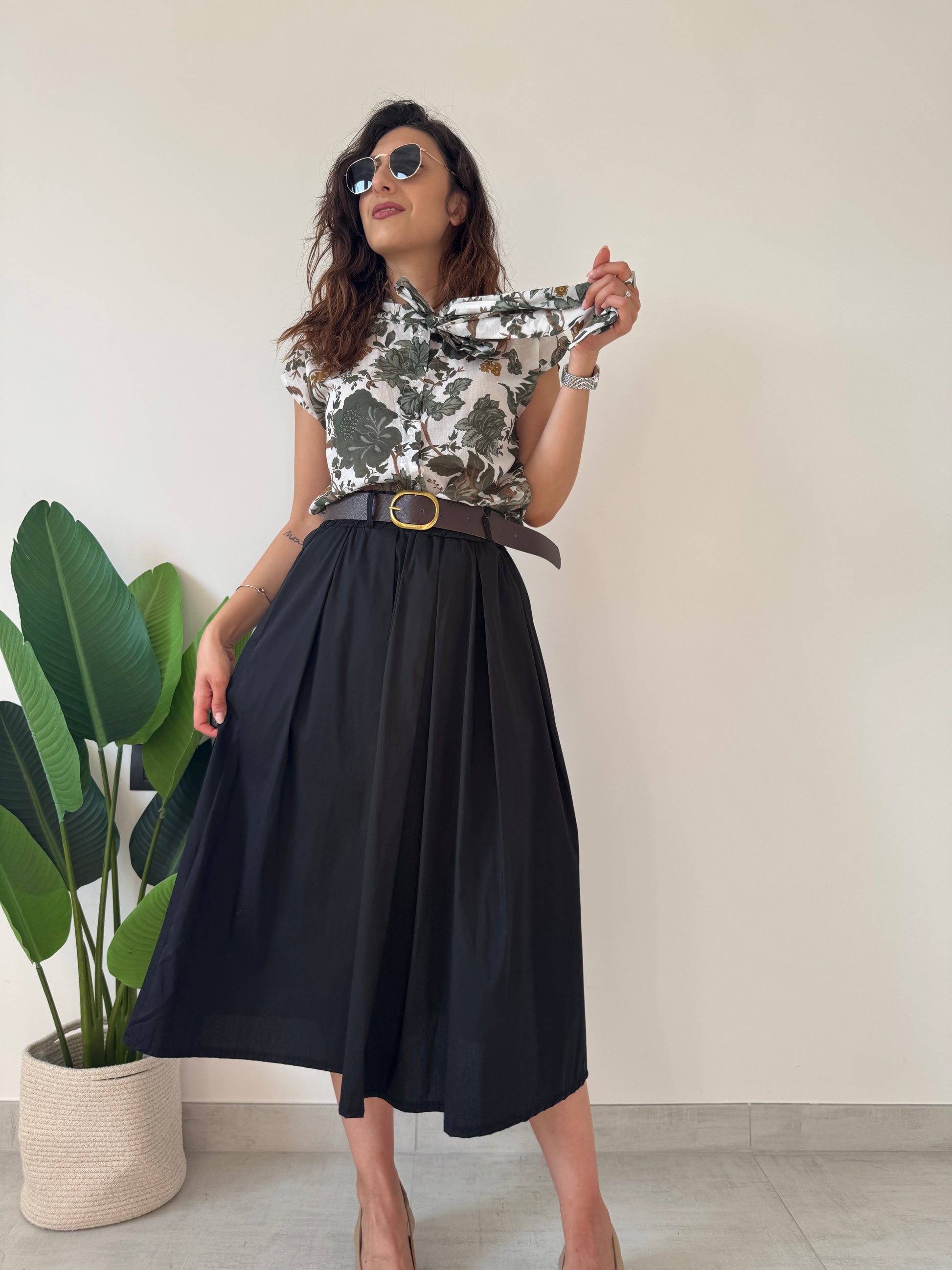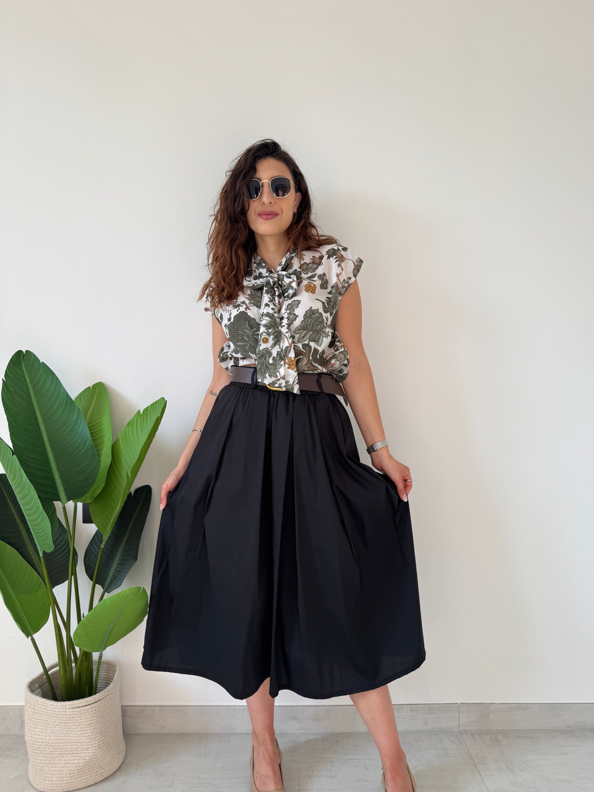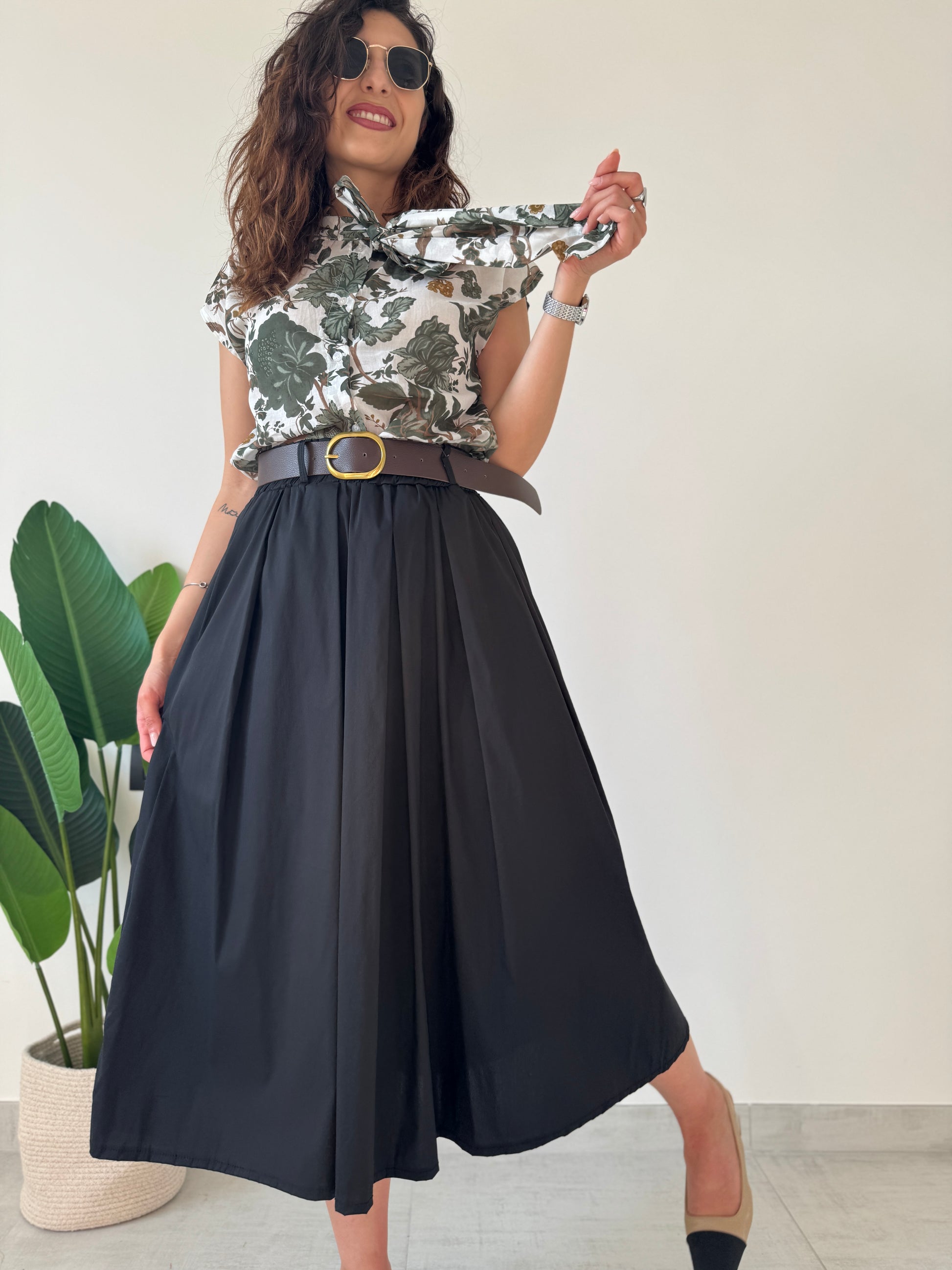 Gonna a ruota in cotone con elastico sul retro, passanti, tasche laterali e cinturino incorporato. Variante colore nera.