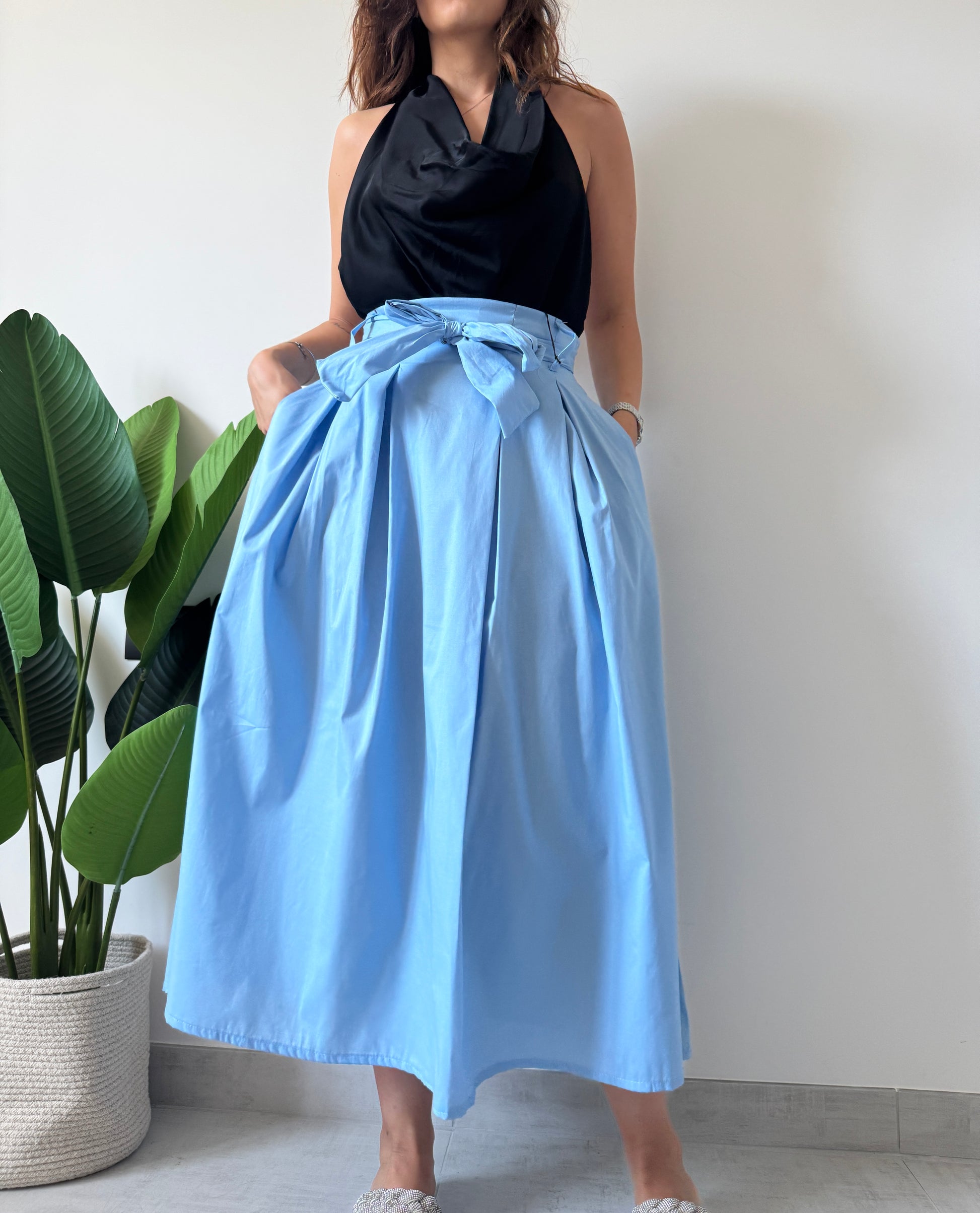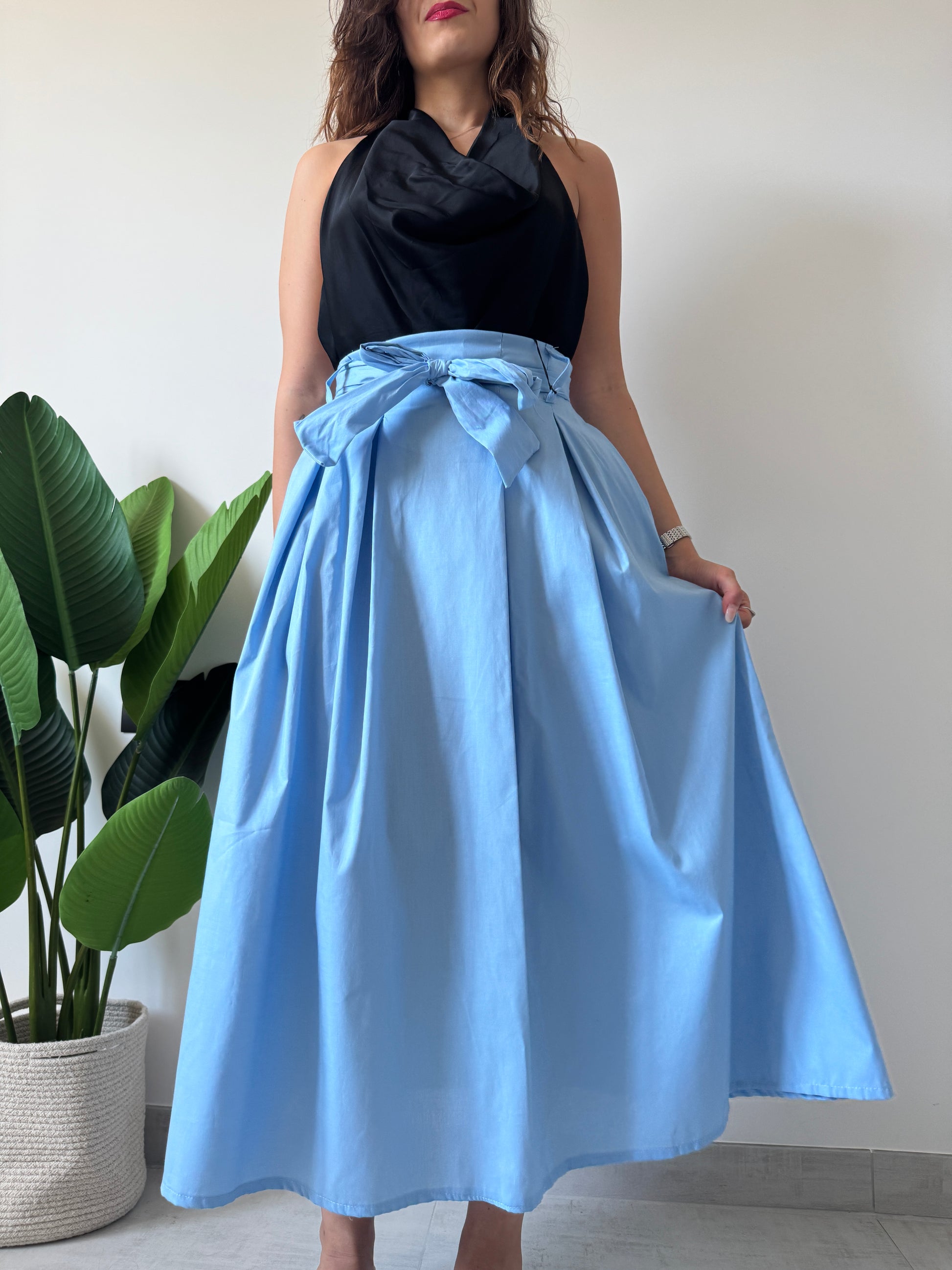 Gonna effetto a ruota con elastico sulla vita, passanti e fusciacca centrale. Variante colore celeste.