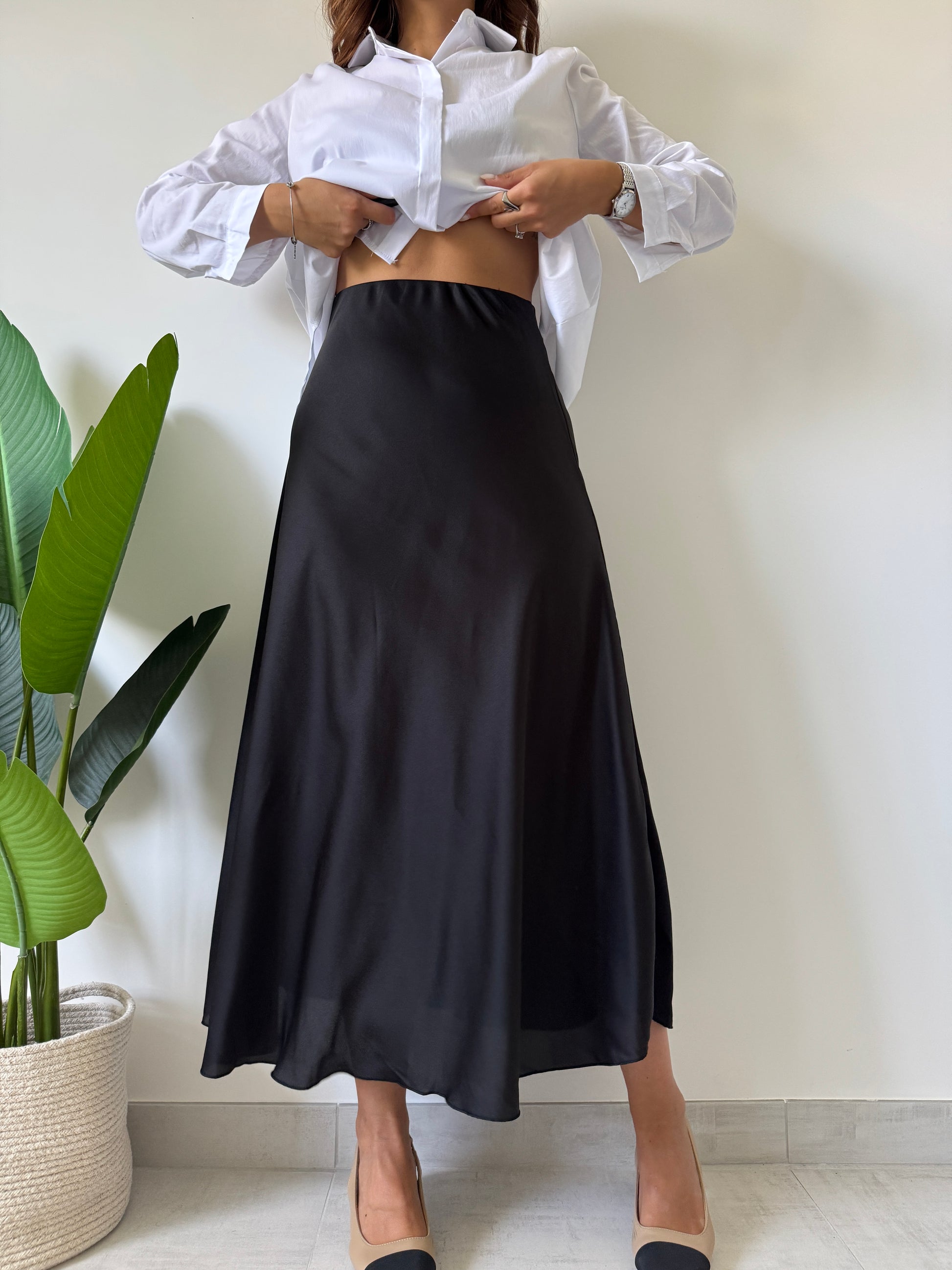 Gonna effetto satin con elastico sul punto vita. Unica variante colore.