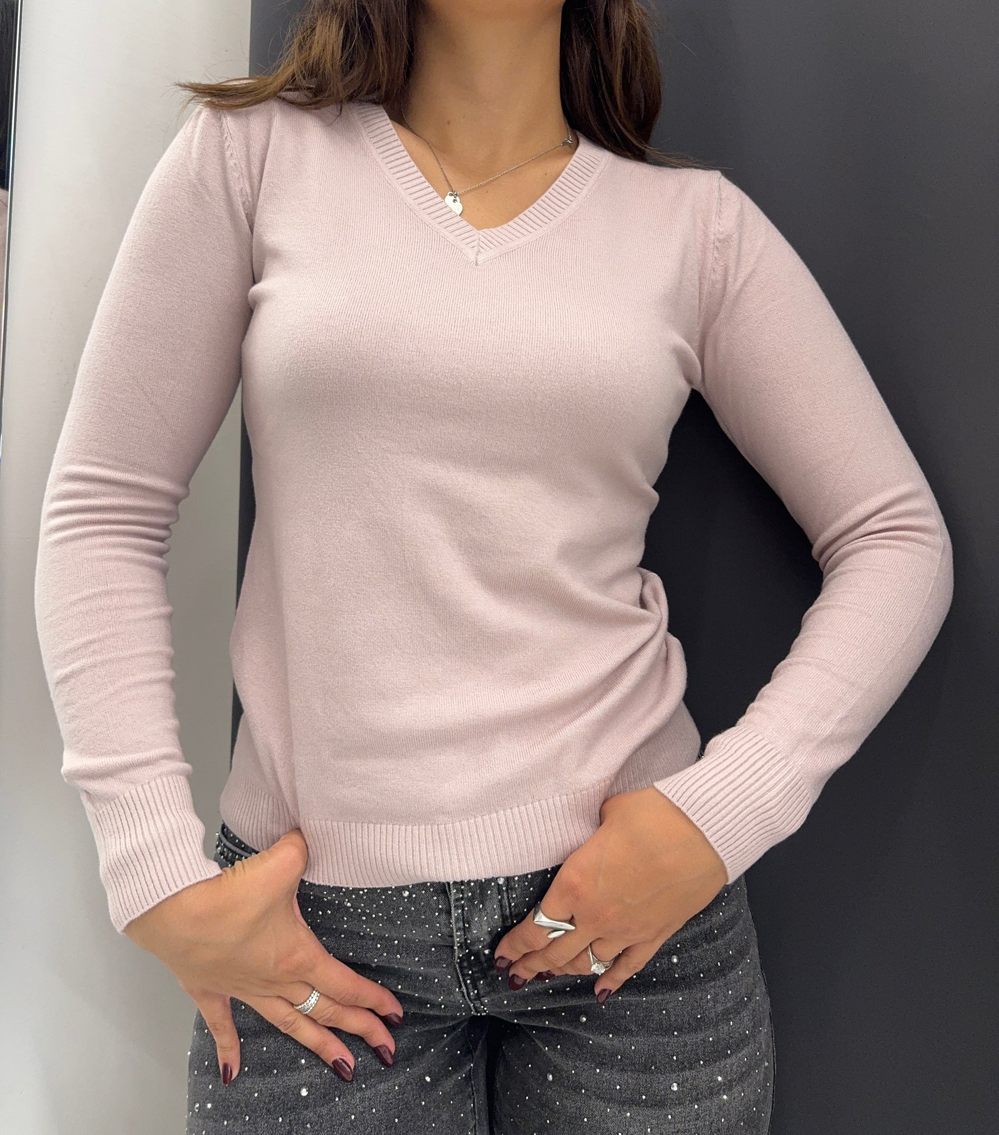 Maglioncino con scollo a V elasticizzato a tinta unita, variante colore rosa.