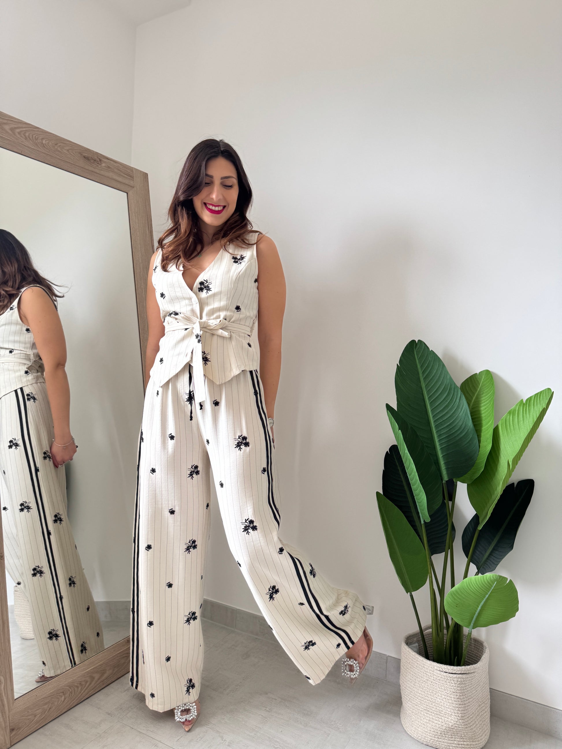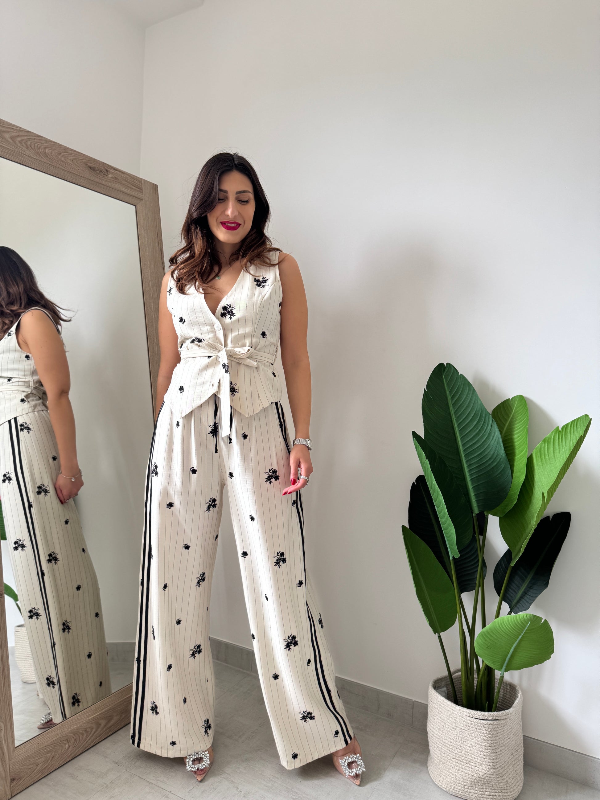 Pantalone palazzo firmato casa Brend con effetto gessato, banda laterale, dettagli fiorati e laccio sul punto vita. Unica variante colore.