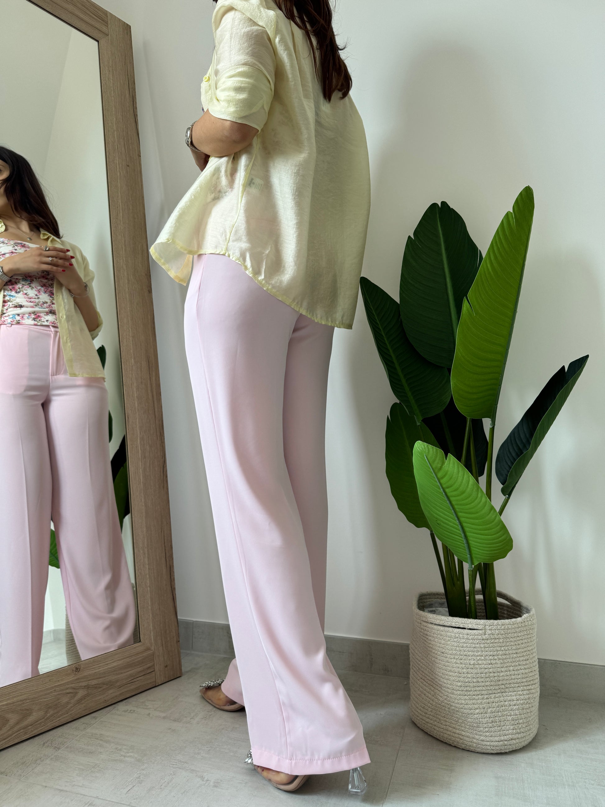 Pantalone palazzo morbido firmato casa Brend con gamba dritta, bottone centrale, passanti, zip e tasche laterali. Unica variante colore.