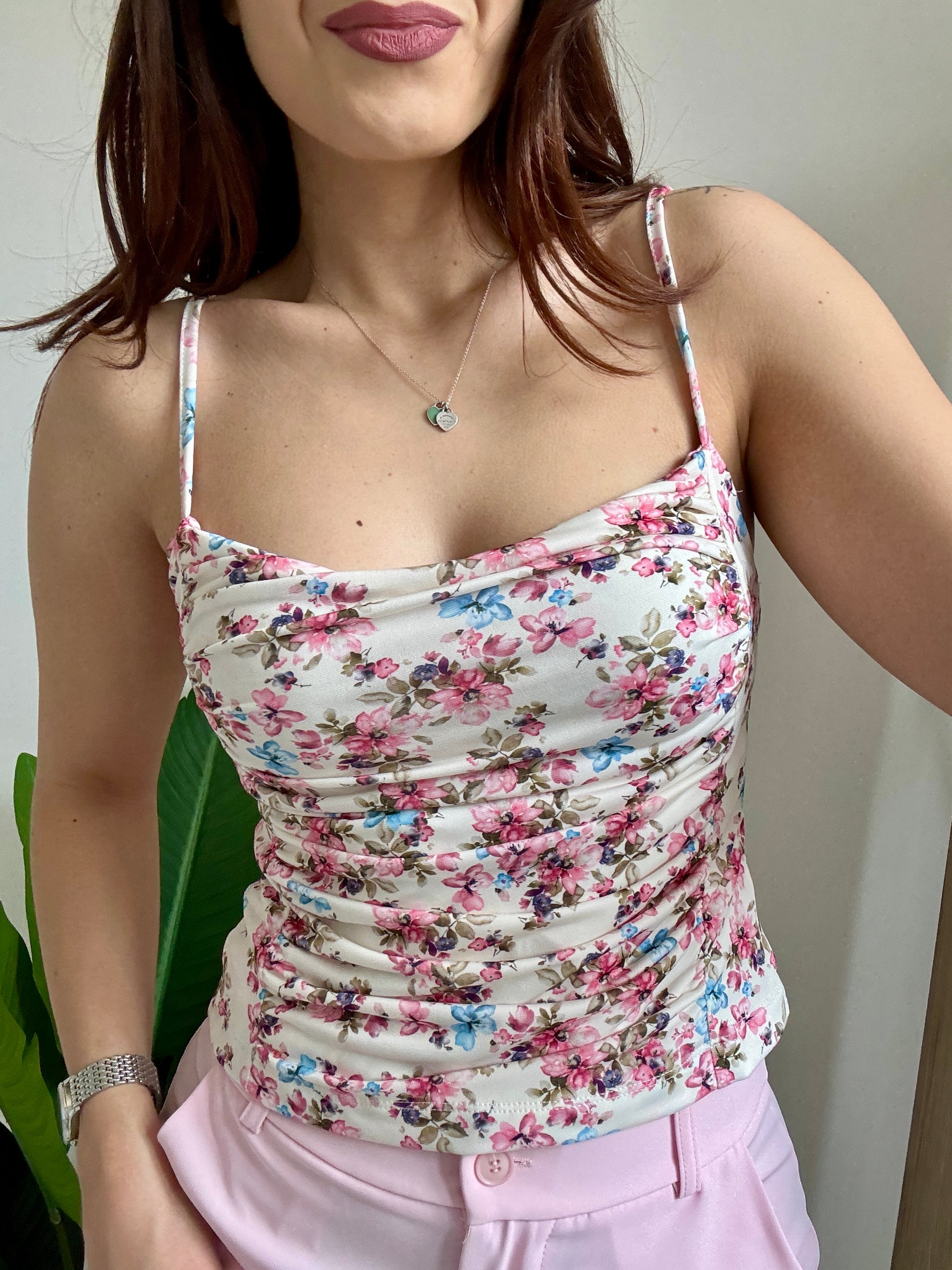 Top corto firmato casa Susy Mix con fantasia floreale, arricciatura sul davanti e spalline regolabili. Unica variante colore.