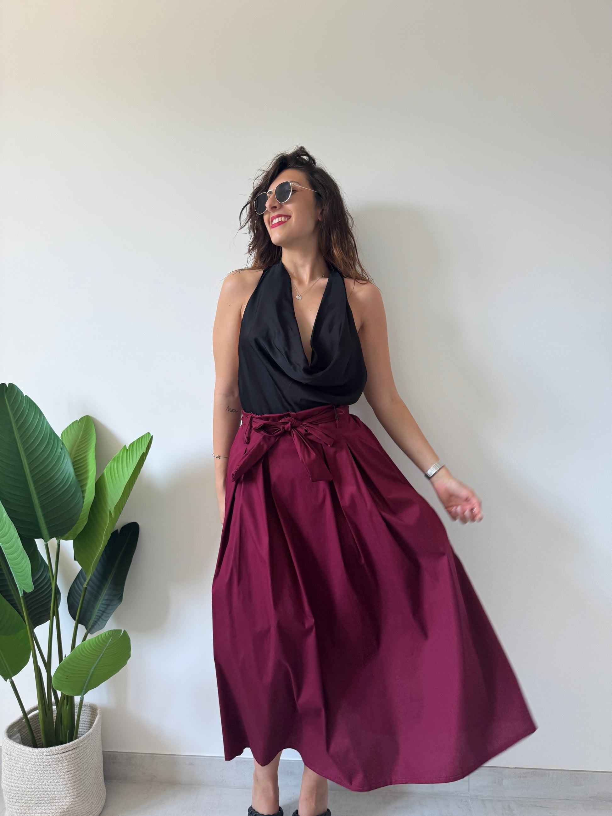 Top effetto raso con scollo profondo sul davanti, chiusura dietro il collo con schiena scoperta. Variante colore nero.